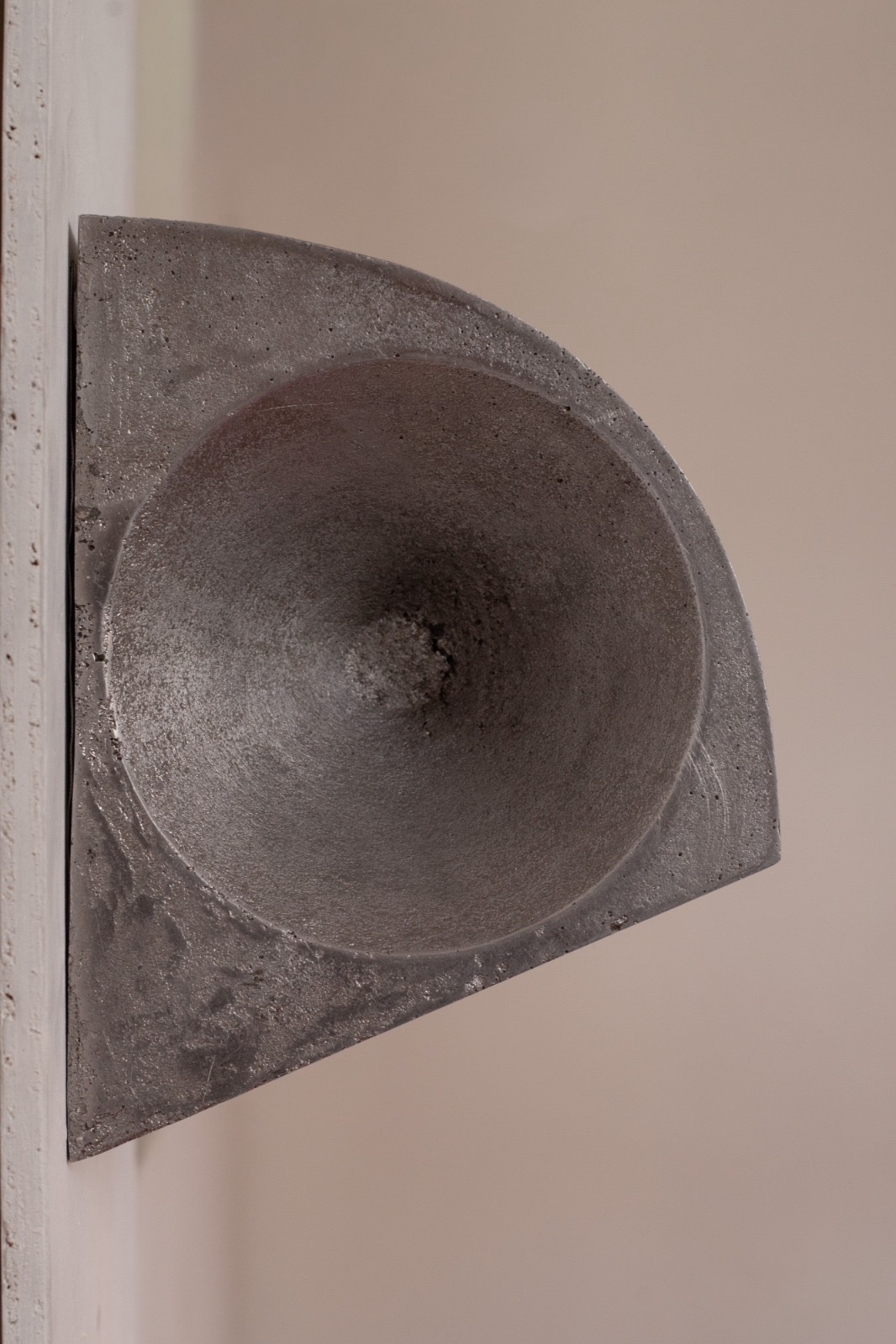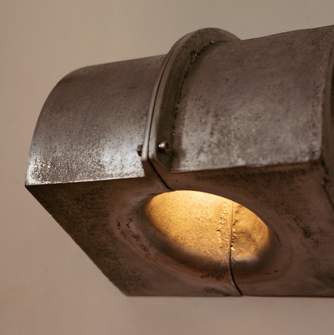 The Hooded Sconce is an iteration on the two-part cast aluminum horn designed for the Bookshelf Speaker, this time mounted to the wall and fitted with interior halogen lighting components and fittings.