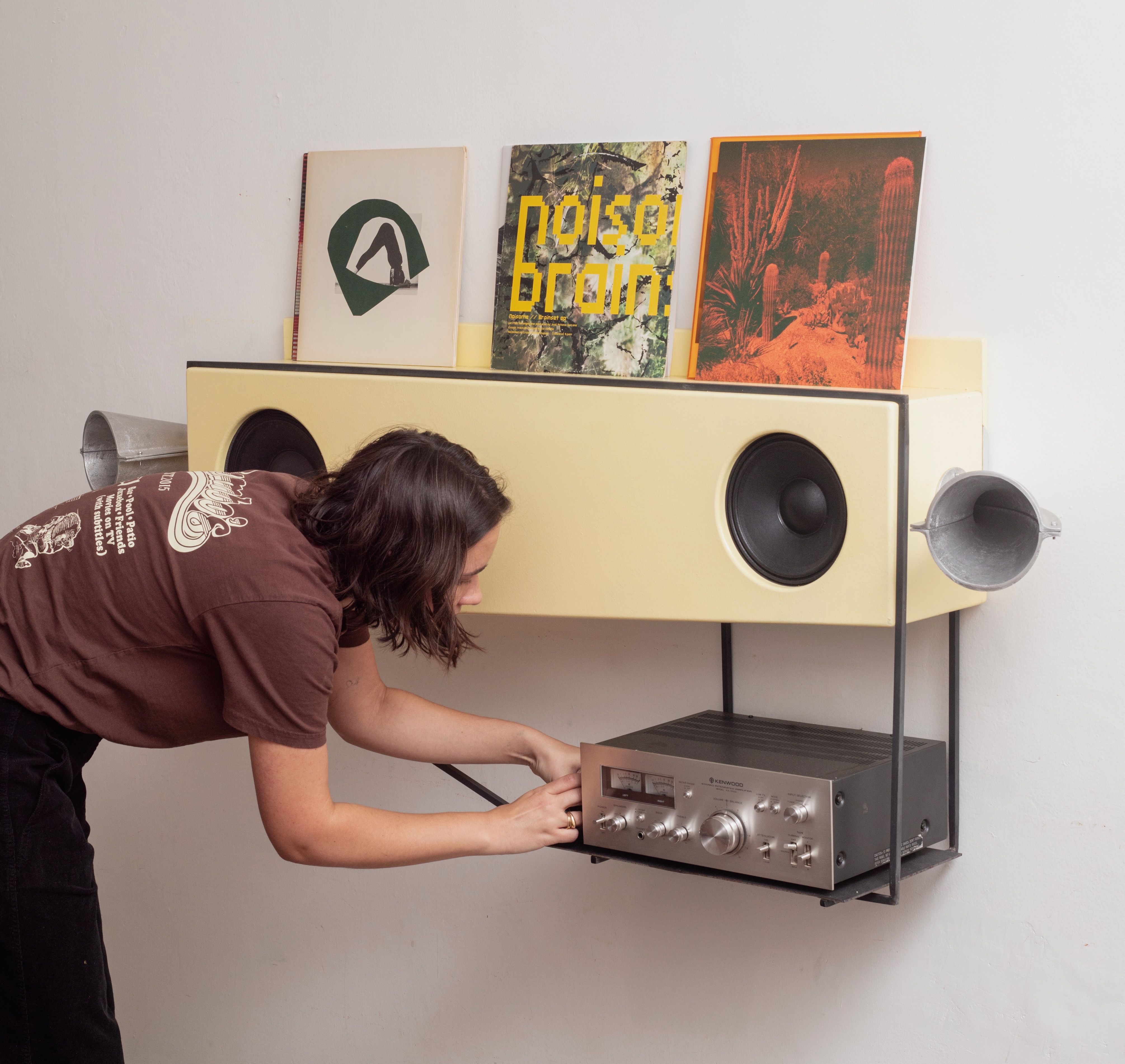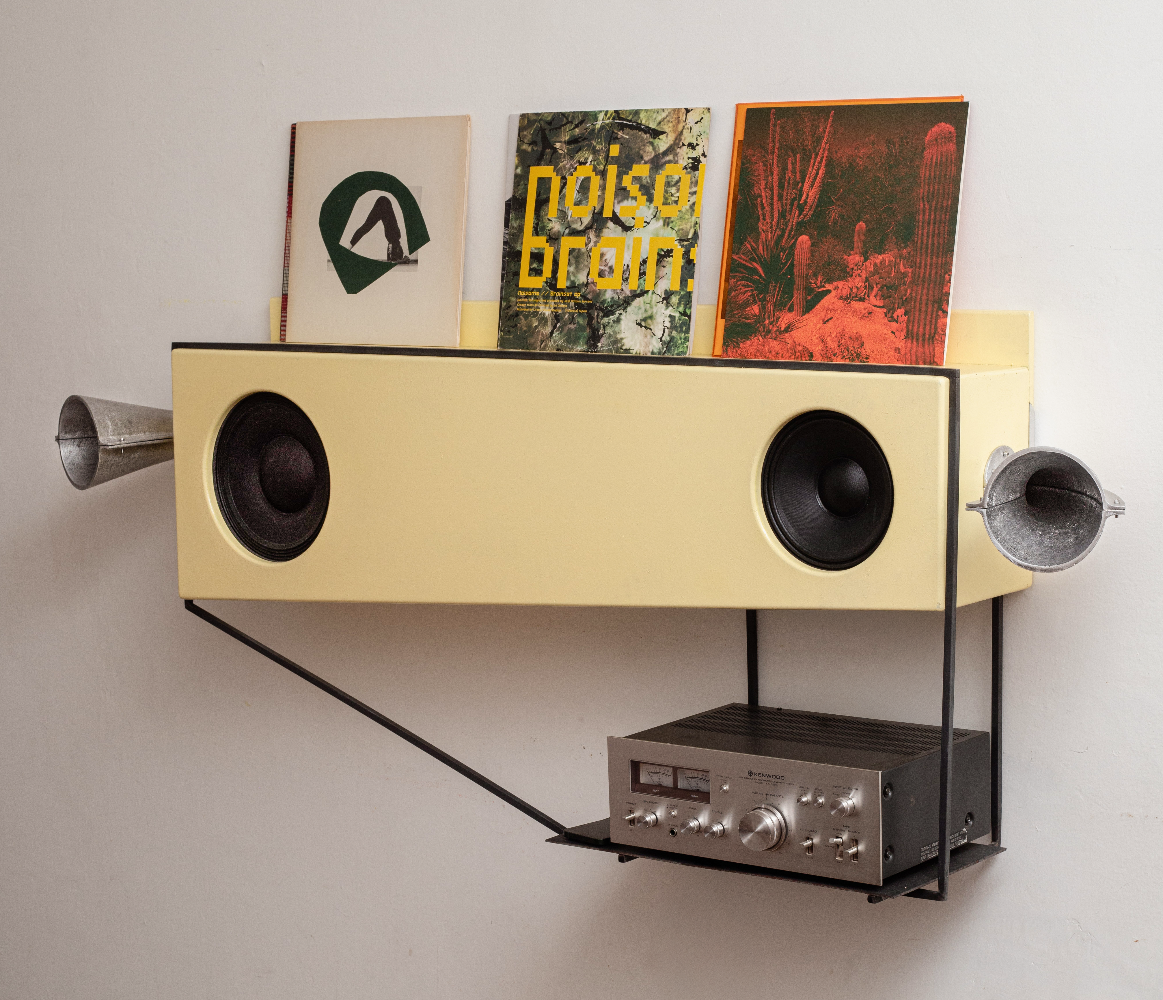 The Wall Speaker is a 3-channel wall mounted speaker loosely inspired by Dieter Rams’ Braun Wall Unit of the 1960s, with obvious departures. The speaker also functions as a record shelf, and mimic the wrap-around belted aesthetic of mechaical systems like film projectors, cassettes, and other gear-driven, analog technologies.