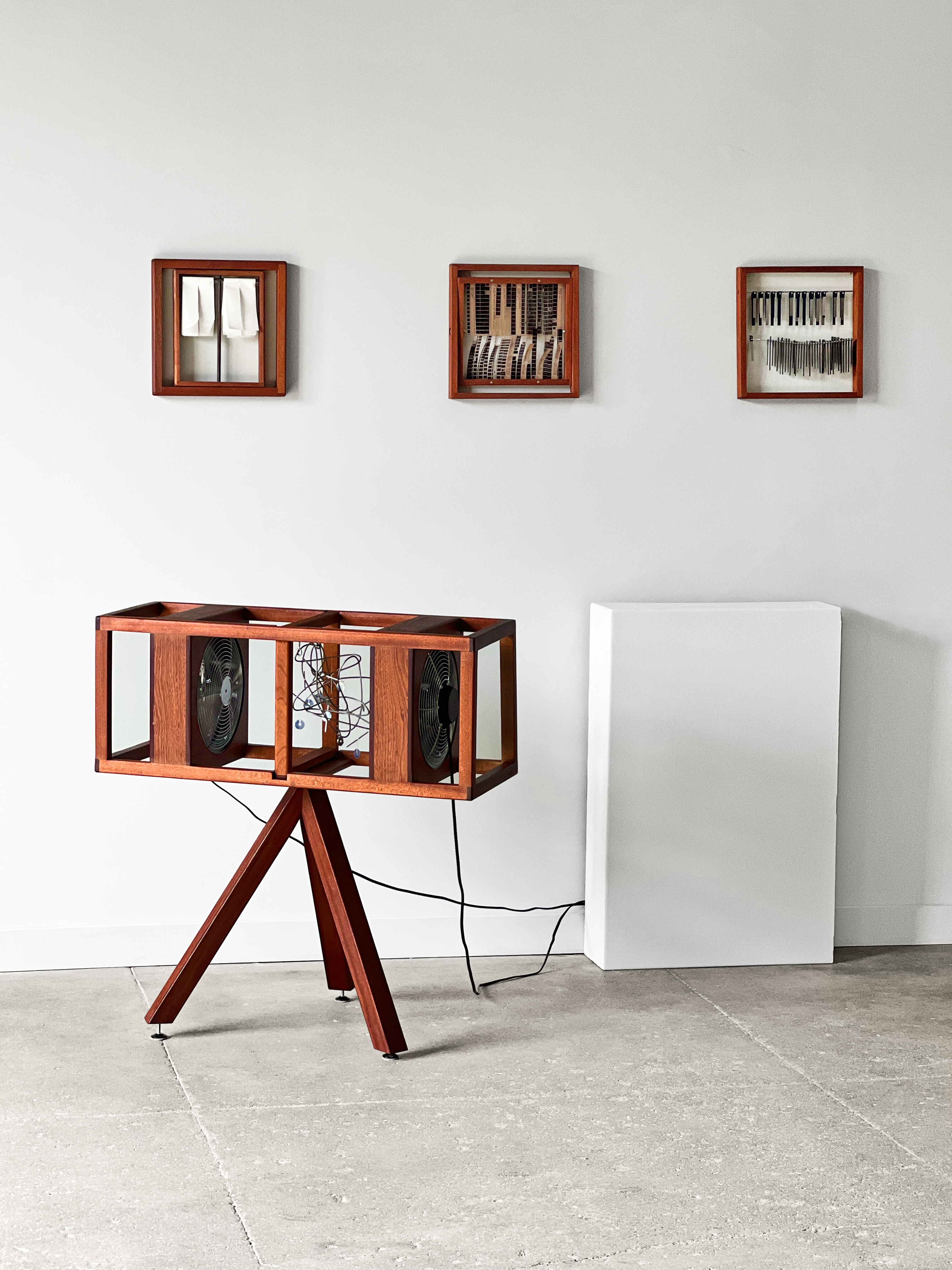35 x 14 x 37 inchesSapele, industrial fans, removable screens, found materials